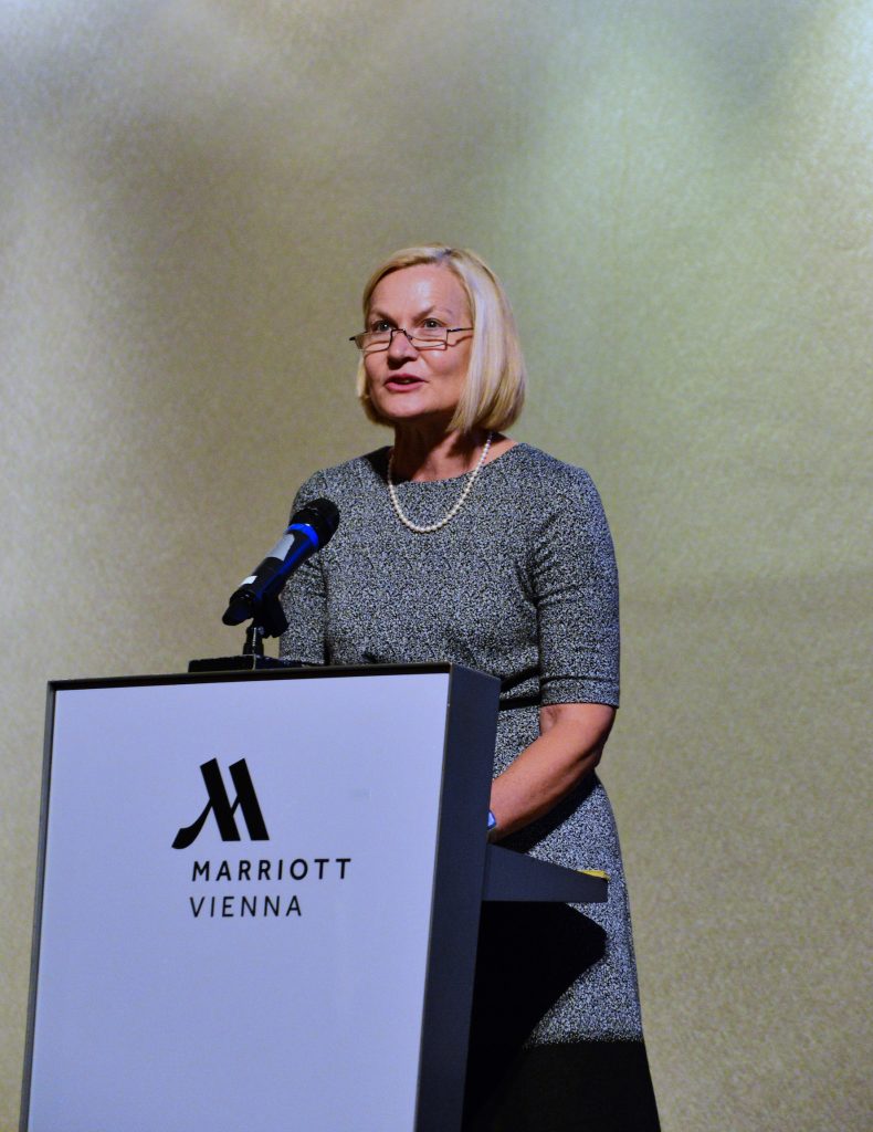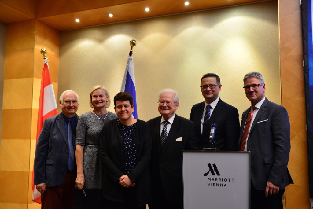 The speakers (Helmuth Eiwen (Pastor of the ICHTHYS congregation), Marie-Louise Weissenböck (C4I Austria) Silvia Berlatski Baruch of the Israeli Embassy, (Alternate Permanent Representative to United Nations in Vienna), Dr. Raoul Kneucker (Jerusalem Foundation), Karl Klanner (ICEJ) and Pastor Edwin Jung (Pentecostal Church Austria)