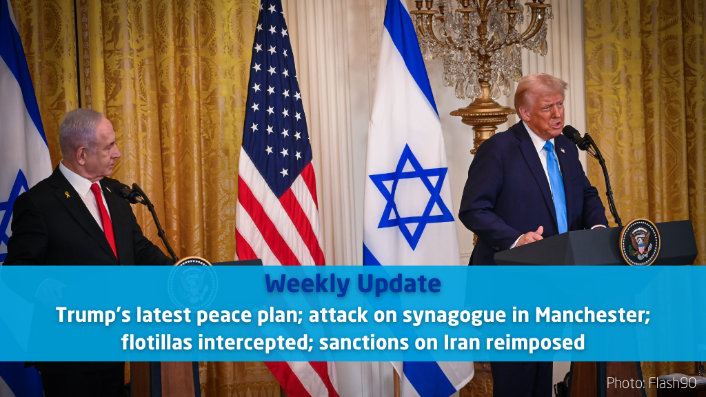 Trump’s latest peace plan; attack on synagogue in Manchester; flotillas intercepted; sanctions on Iran reimposed