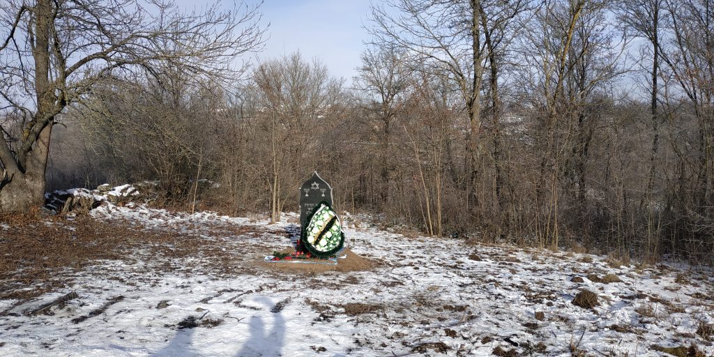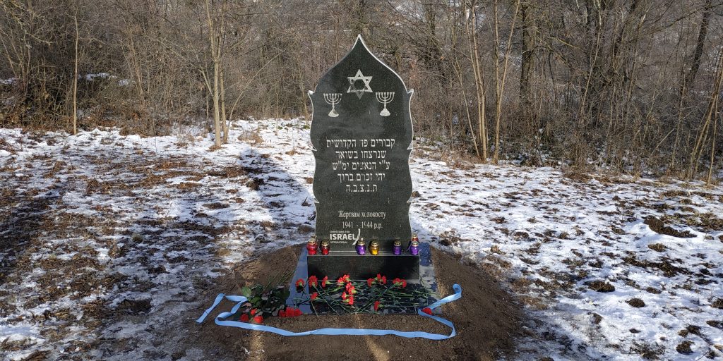 The monument, which was unveiled on 7 December 2018 by Christians for Israel, is located on a third mass grave, next to an old Jewish cemetery in Murovani Kurylivtsi. At this mass grave Jews were shot dead by a German commander over a longer period. He killed a few Jews each a time. The Jews were brought to him by the Ukrainian police, to a place where the policemen already dug a pit. The Jewish people had to undress and stand at the pit. According to Katarina Dimitrovna, the German commander was always present and usually he was the one who shot the Jews. The policemen covered the bodies with some earth.The Jews who were murdered here not only came from Murovani Kurylivtsi but also from surrounding villages.