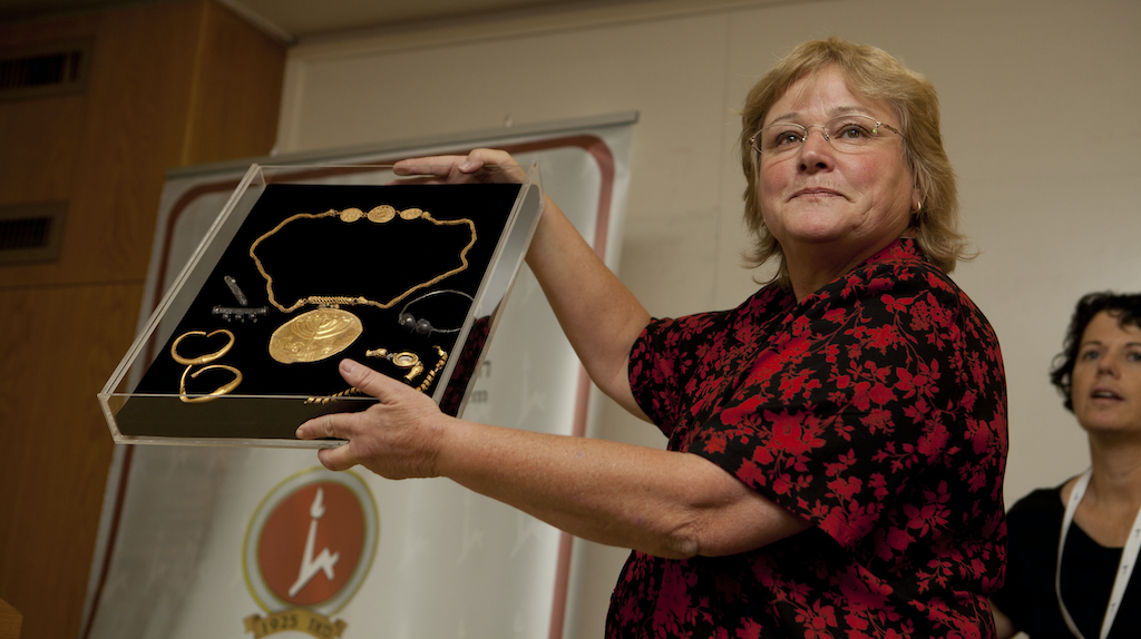 Israeli archaeologist Eilat Mazar shows an ancient medallion dated to the late Byzantine period (early seventh century CE) with a shofar (ram’s horn) and a Torah scroll icon at the Hebrew University in 2013. | Photo Flash90