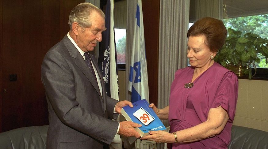 Pres. Chaim Herzog and state comptroller Miriam Ben Porath looking at the cover of 39th state comptroller’s report covering the last two years at Beit Hanassi (15/05/1989) Photo: Wikimedia Commons by Tsvika Israeli