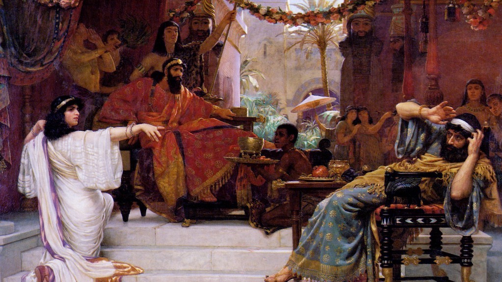 Queen Esther, who is facing King Ahasuerus, points towards Haman, who is cowering away – Painting by Ernest Normand (1857-1923) | Photo: Wikimedia Commons