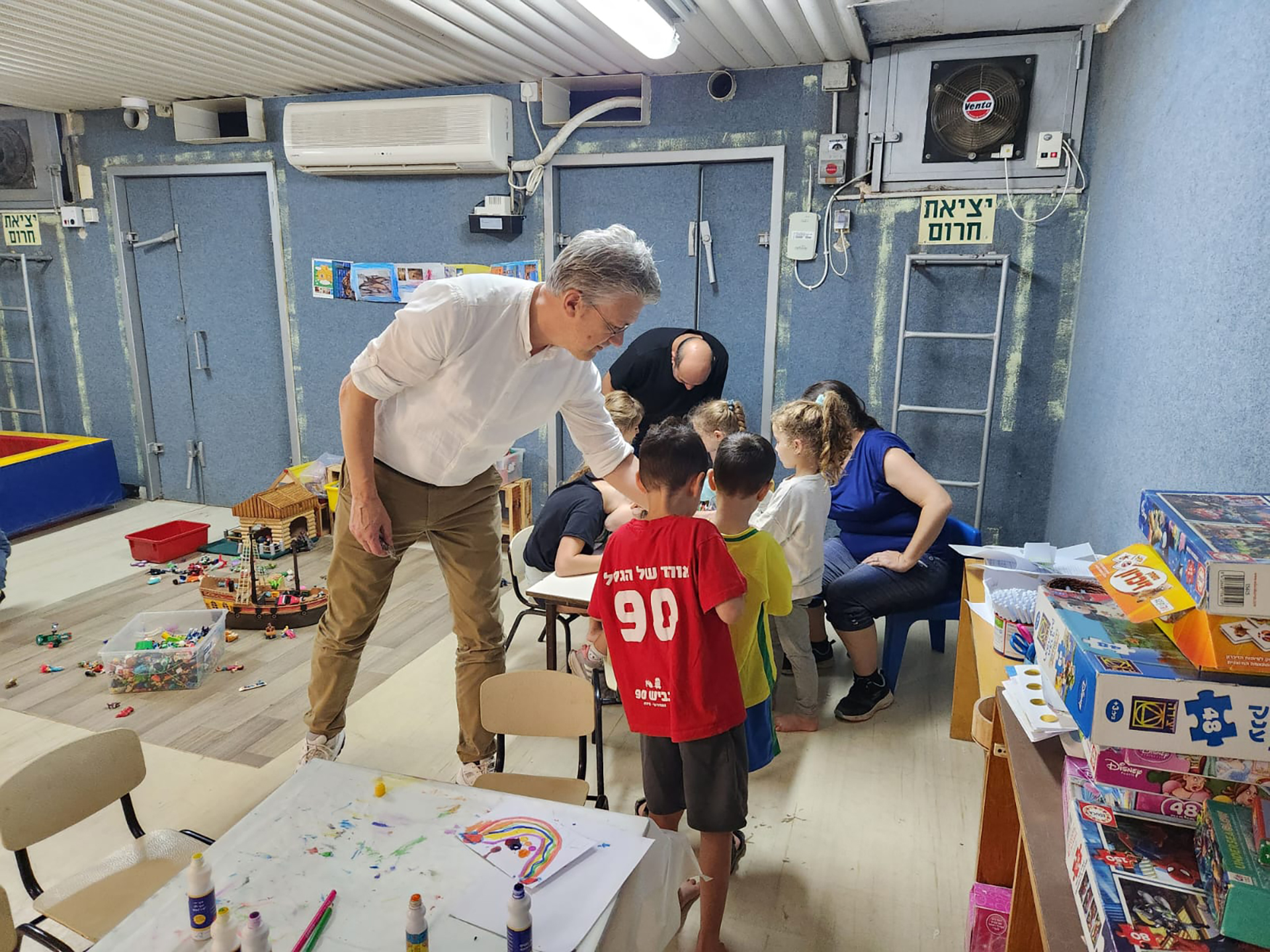 Eran is in charge of the third line. The residents of this kibbutz have not been evacuated, but it is not safe to take the children to school in other villages now, so each village organizes its own education, from primary to secondary school. He takes us to another underground bunker where elementary school groups 1, 2 and 3 are located. Eran explains that the children are offered as much daily routine as possible, although that routine does not allow them to play outside. Orit aptly sums it up: we are in survival mode, prepared for the worst. In a radio studio down the road, the staff thank us for coming. ‘It means so much to us, that you have come to see us in this difficult time.’ Not for the first time, tears well up in the eyes of the people we meet. In most countries people don’t realize Israel is not only fighting Hamas in Gaza, but the whole country is at war.
