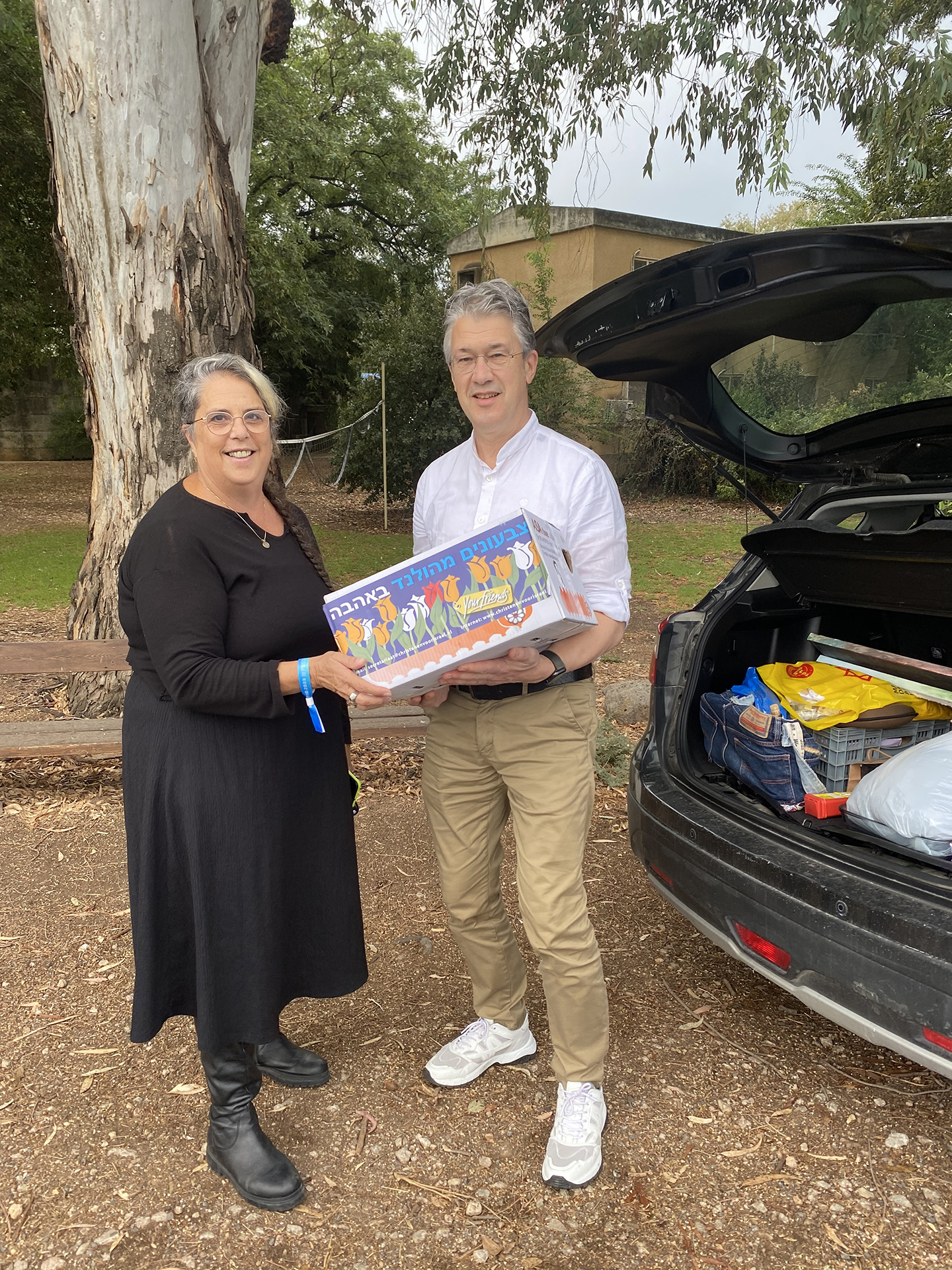 The airport is quiet and peaceful. There are signs everywhere pointing to the nearest bomb shelter. In the long hall toward passport control we see the photos of the more than 230 Israelis taken hostage. They are not forgotten by Israel. Standing in line for passport control, we have to come with a security officer for questioning. They want to know why we have come and where we are going. “To be with friends in their time of need”, is enough to be granted entry.