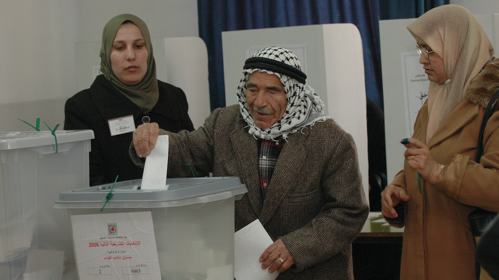 An elderly Palestinian man posts his vote in the Palestinian government elections in 2006. Photo: Flash90