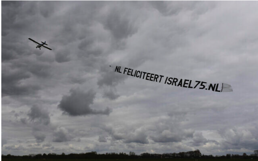 Christians for Israel hires four planes to trail giant banners congratulating the Jewish state on its 75th birthday. Roger van Oordt, honorary consul for Israel in The Netherlands and previous executive director of Christians for Israel: “We want to show Israel that it has widespread support in the Netherlands and we also want to encourage the Jewish community of the Netherlands through the flyover, to show it’s not alone.”
