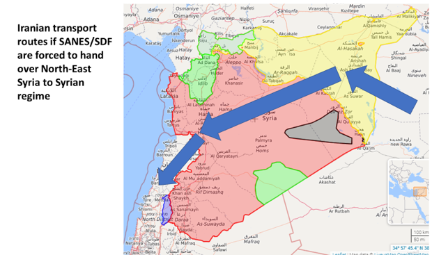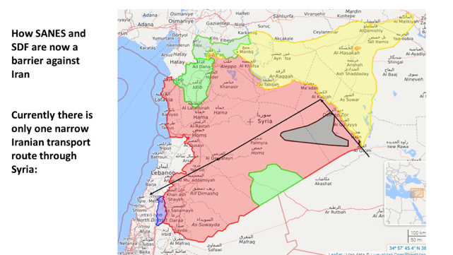 If the US leaves without protection of SANES against Turkey the following will happen. Moscow promised SANES and SDF protection against Turkey if they merge with the Assad regime. If there is no other solution, this will for sure happen as Turkey would otherwise destroy and murder both the Kurds and the Syriac-Assyrian Christians (as we have seen in Afrin). If that merger happens there will be no barrier anymore against Iran as Moscow and Assad will instruct the SDF to let them through. Here you see the difference: