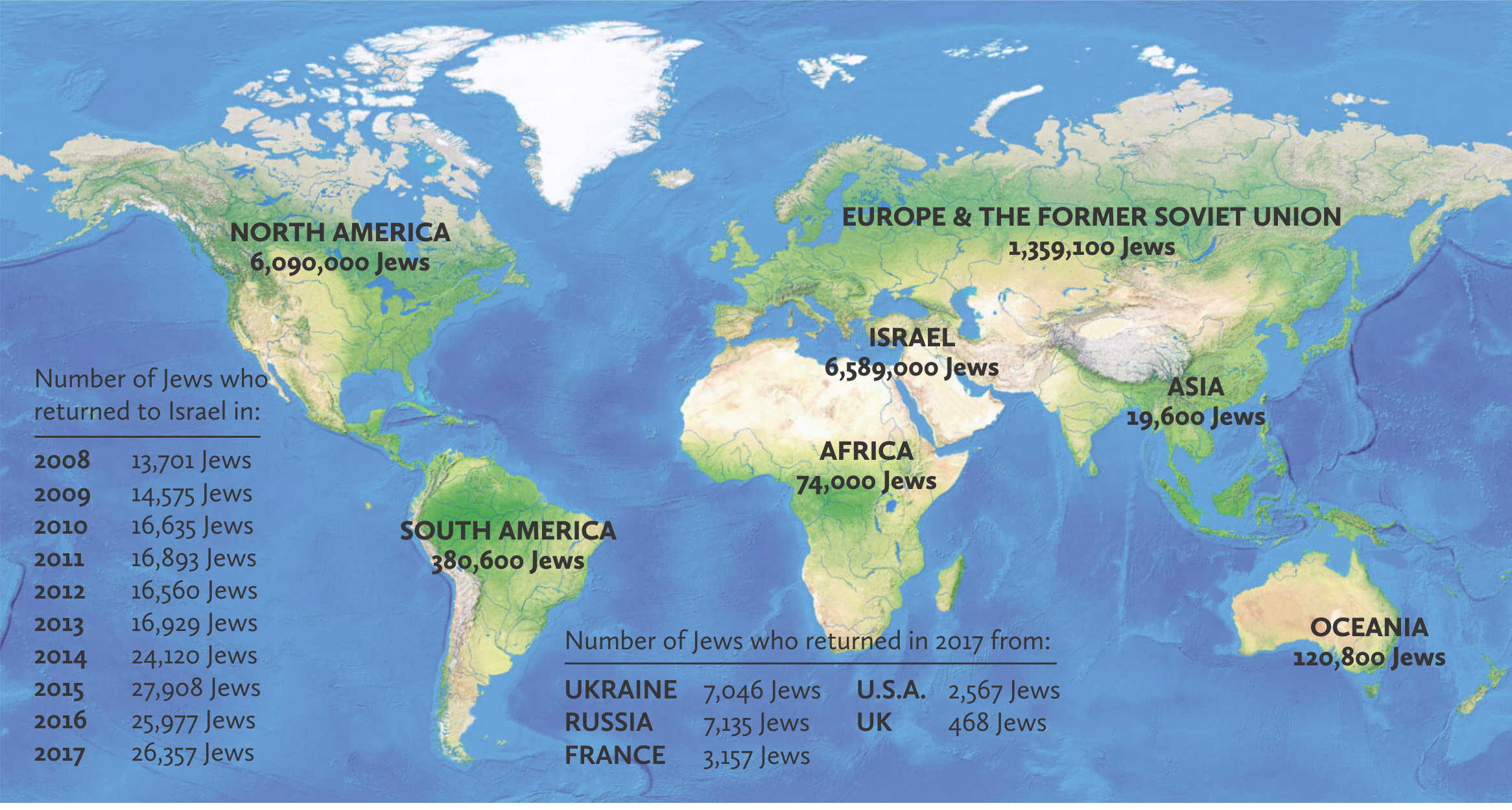 The following infographic shows how many Jews live around the world according to official figures. It also contains an overview of how many Jews went to Israel in the past decade. For 2017 we specified the number of Jews leaving from certain countries. These figures do need some explanation.