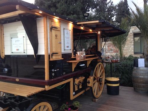 On the plaza at the windmill, there is an attractive wooden cart where you can buy coffee. Together with some tables and chairs, it makes the area around the windmill more inviting. Now you can take in the view of Jerusalem with a nice cup of coffee.