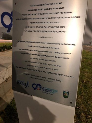 Sderot was chosen deliberately, a city only a few kilometres from the Gaza strip. The inhabitants suffered severely under the missile terror of Hamas. The menorah is meant as a visible sign of friendship between Dutch Christians and Israel.
