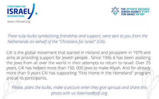 We have also made postcards to be given to all the olim who will plant tulips. They contain some information about C4I and our long-term friendship with them as well as the request to send us pictures when the tulips give sprouts.