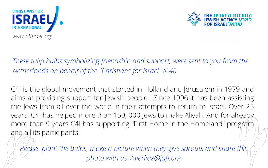 Unfortunately, our friends from Christians for Israel couldn’t visit us with the Tulip tour 2021 because of the new restrictions imposed recently. But we wanted to keep the tradition and handed out the boxes with tulip bulbs, sent to us as a sign of support and friendship to all the coordinators. The bulbs will go to 32 kibbutzim and the coordinators will invite the olim families to plant tulips together. And as we will plant the flowers waiting them to bloom in the coming months it will remind us of the olim arriving in Israel and ‘planting in the Homeland to blossom later on’.