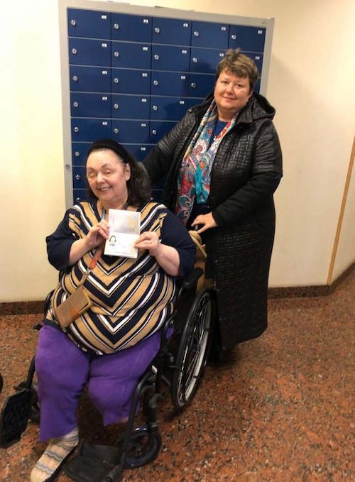 First of all, Elena needed a passport. To apply for an international passport, we had to take her to the city hall with her wheelchair. It was not that easy. Once outside Elena repeated several times: “friends, look, I am in the street, into the fresh air!” She was pleased as Punch and I had tears in my eyes.