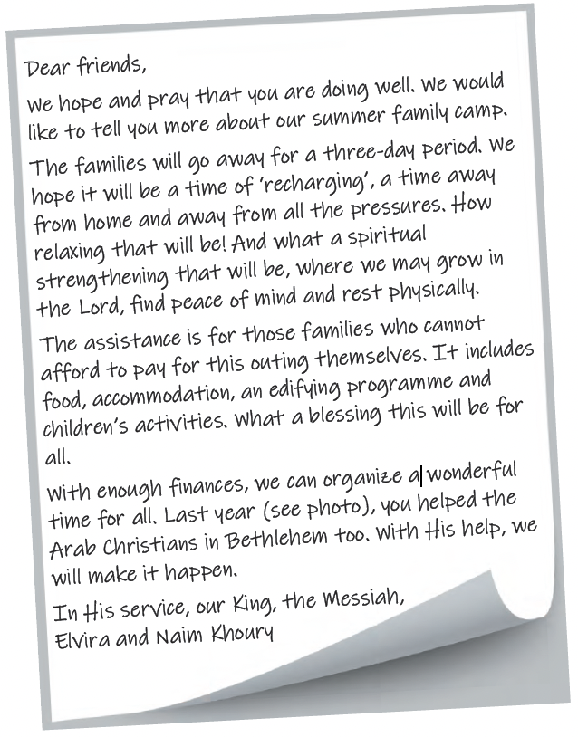 The pastor couple would very much like to offer to members of their congregation a few days of relaxation and for building up their faith. They are asking for help to cover some of the costs of those who cannot afford to attend the camp. Saleem Shalash from Nazareth also hopes to offer activities this summer to those who cannot afford it themselves. Read the letter from the Khoury’s below.