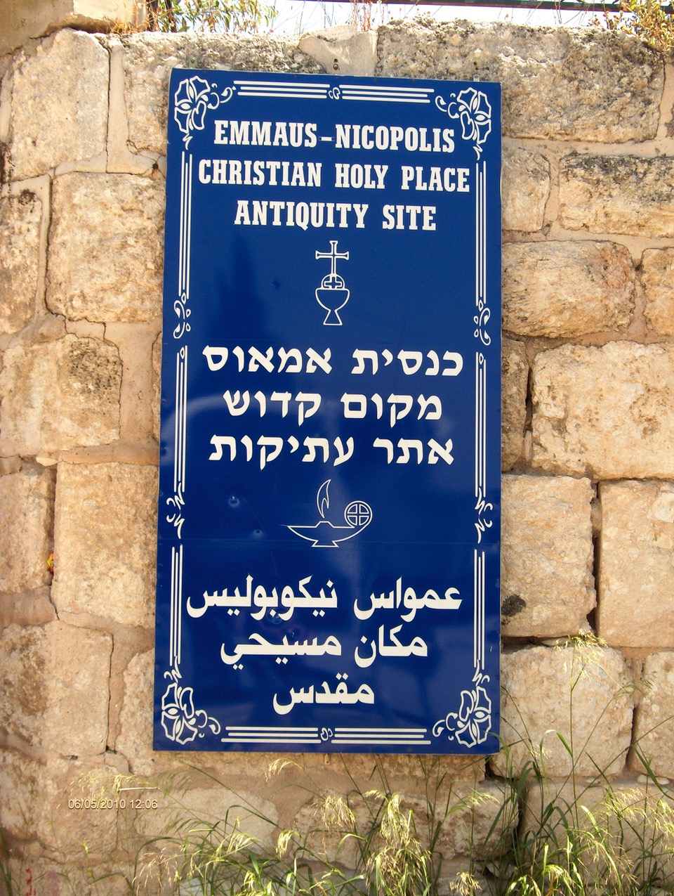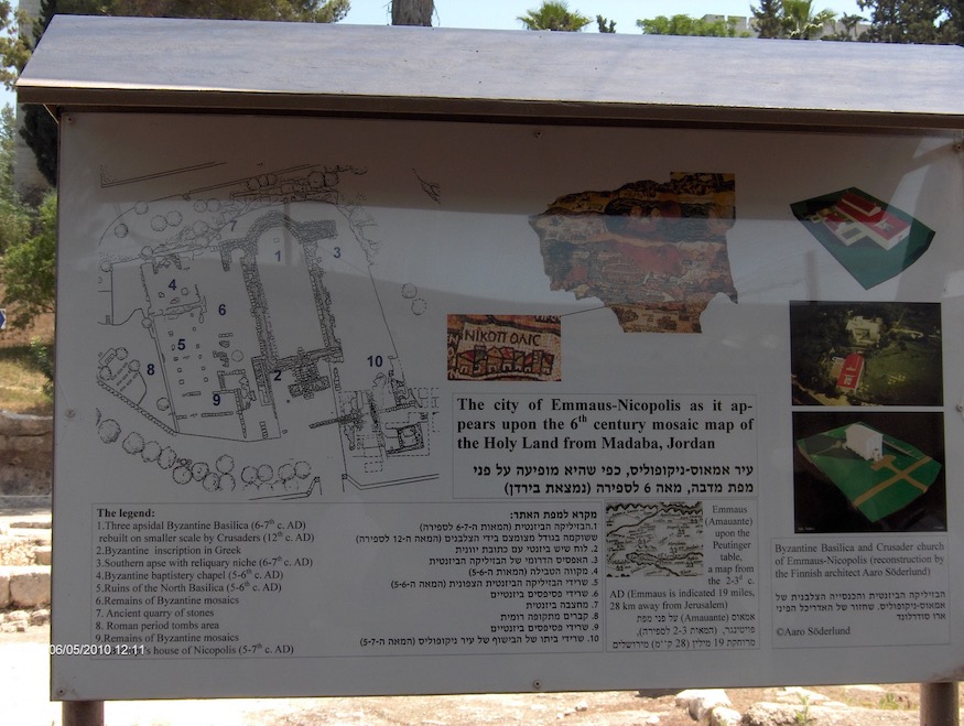 Map at the entrance of the archeological site at Emmaus. Emmaus comes from the Hewbrew word “Chammot”(hot springs). In the third century A.D. the city was called Nicopolis (“City of Victory”). | Photo Christians for Israel International by R. van Neijhof