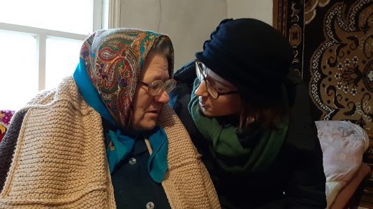 We knocked at Zhenia’s door with two food parcels, fresh bread and warm winter clothes in our hands. When we wrapped Zhenia in a blanket that a lady from Germany had knitted for her, she started crying.